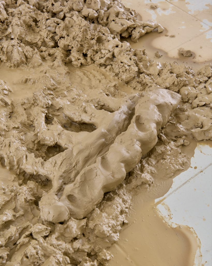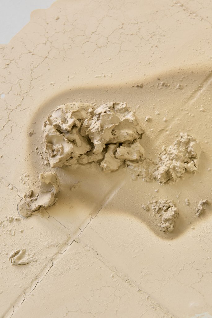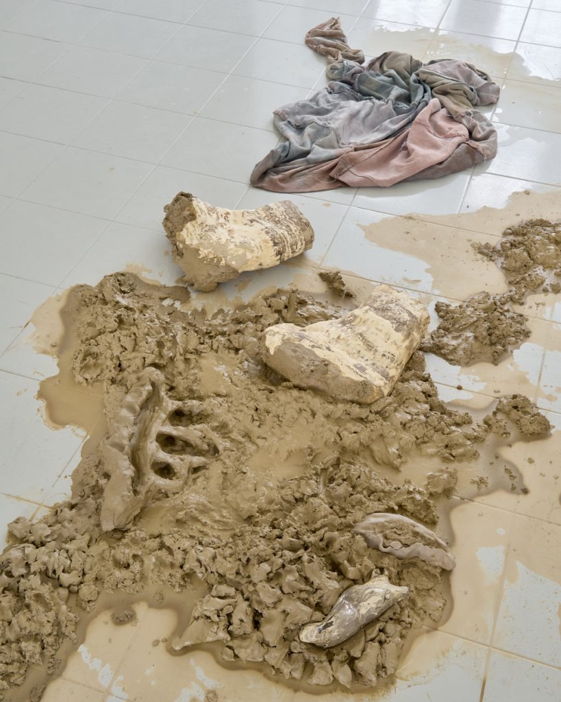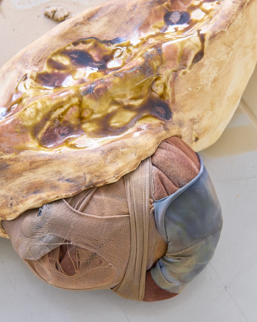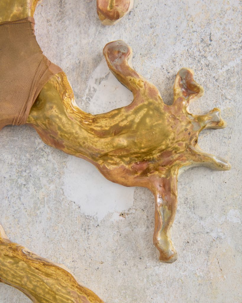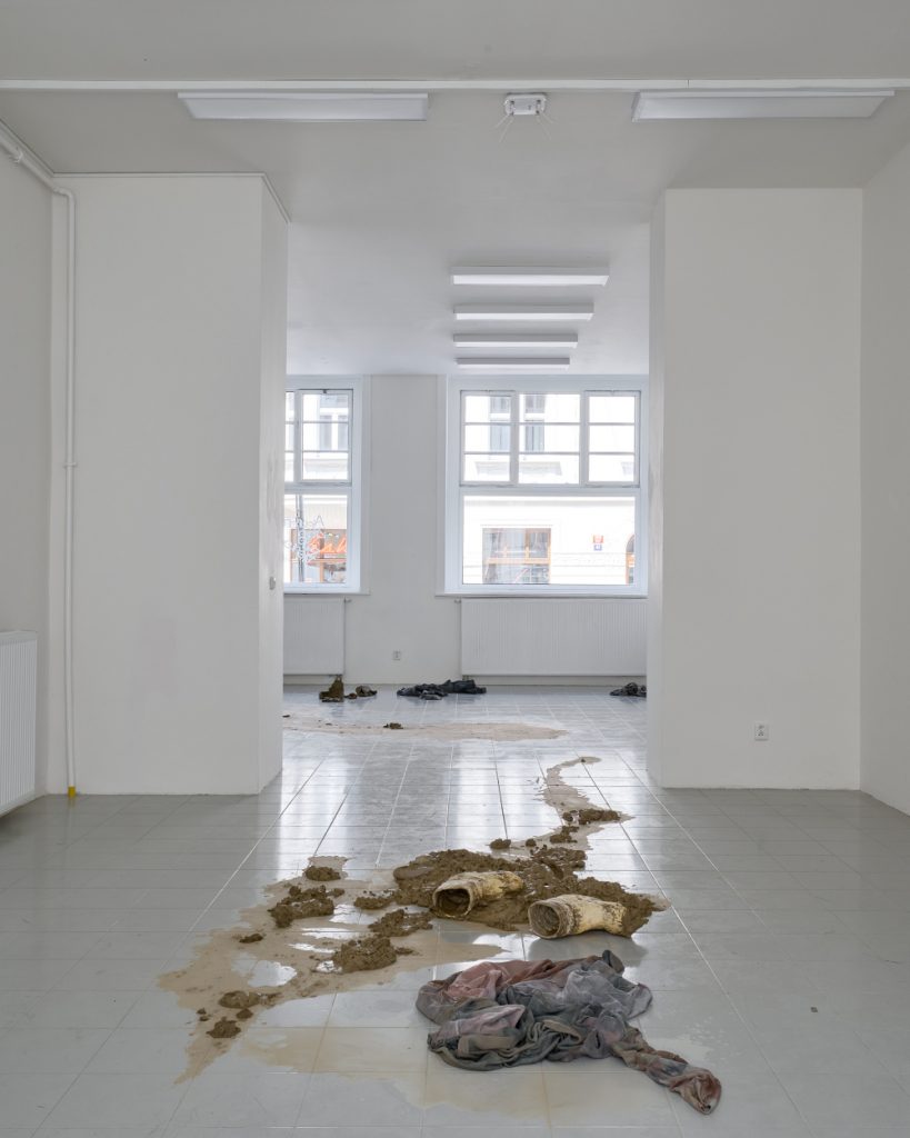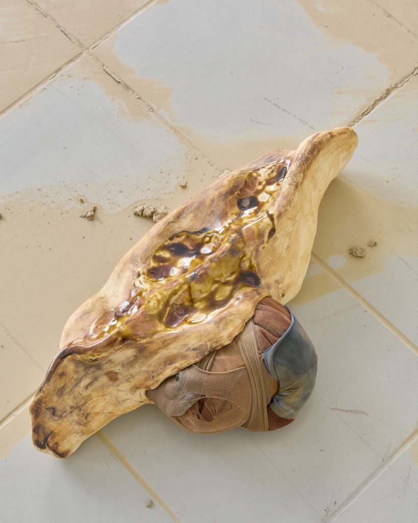 Projekt Aleuronové zrno Nely Britaňákové představuje neurčité prostředí utvářené těly, hlínou, textilem, v němž se stírá druhová identita. Ve zpomaleném světě přežívají zbytky života i zárodky nových forem nesoucí stopy úzkosti, transformace i pomalého zániku.