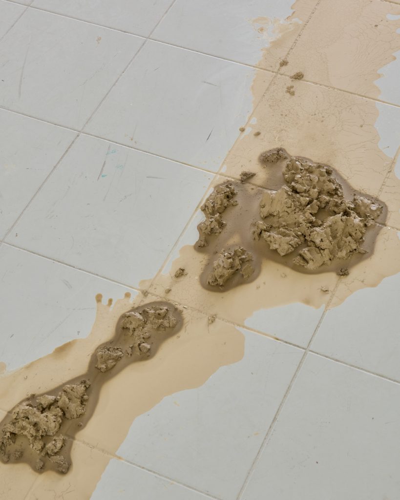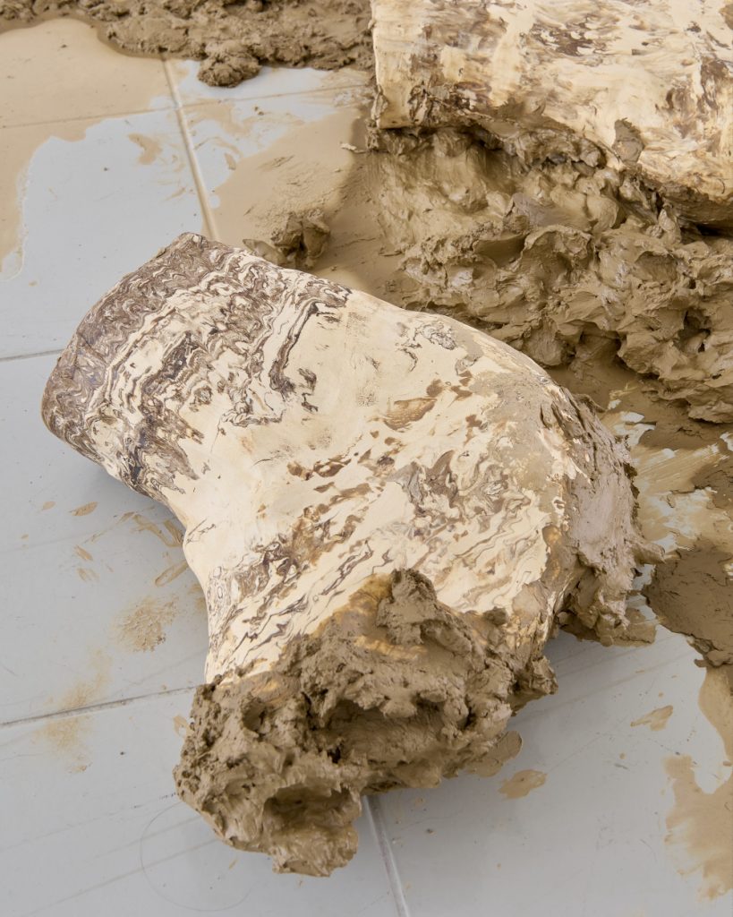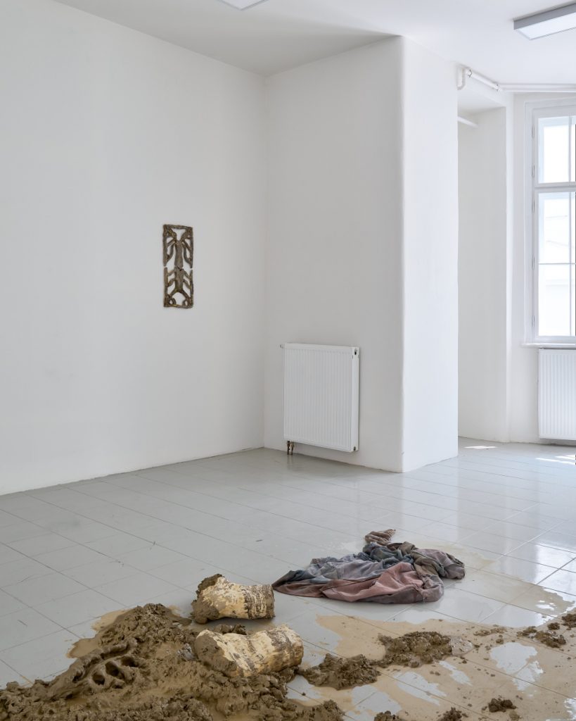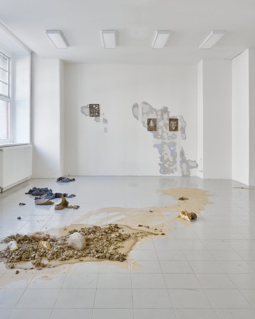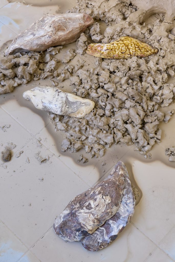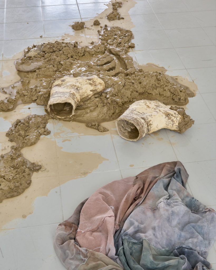 Projekt Aleuronové zrno Nely Britaňákové představuje neurčité prostředí utvářené těly, hlínou, textilem, v němž se stírá druhová identita. Ve zpomaleném světě přežívají zbytky života i zárodky nových forem nesoucí stopy úzkosti, transformace i pomalého zániku.