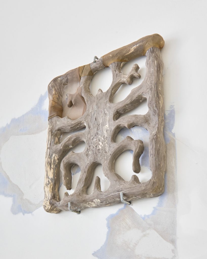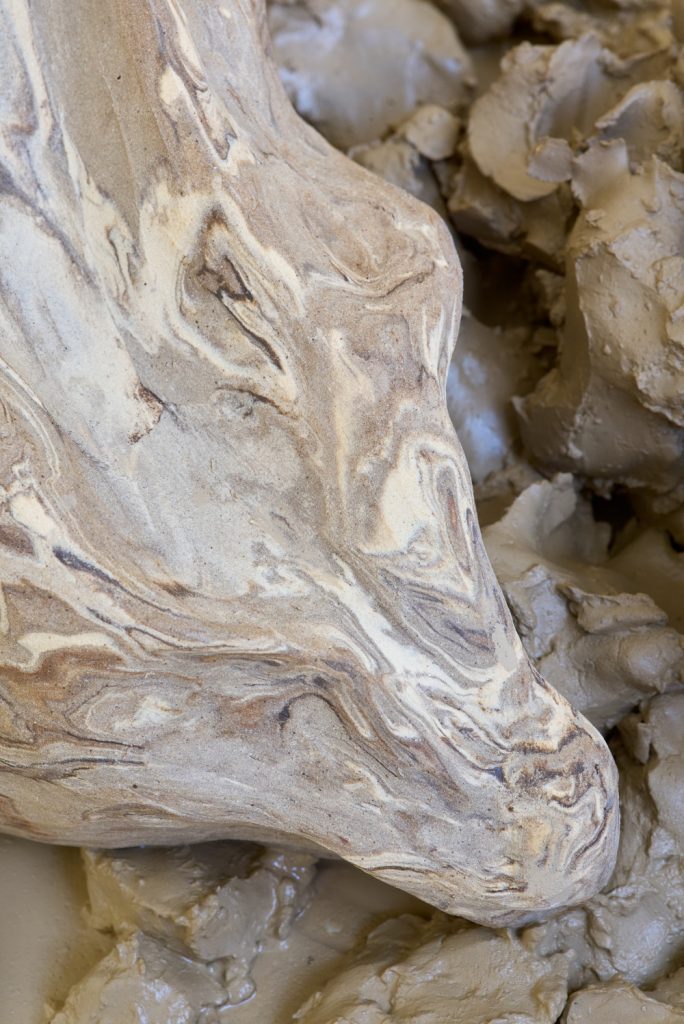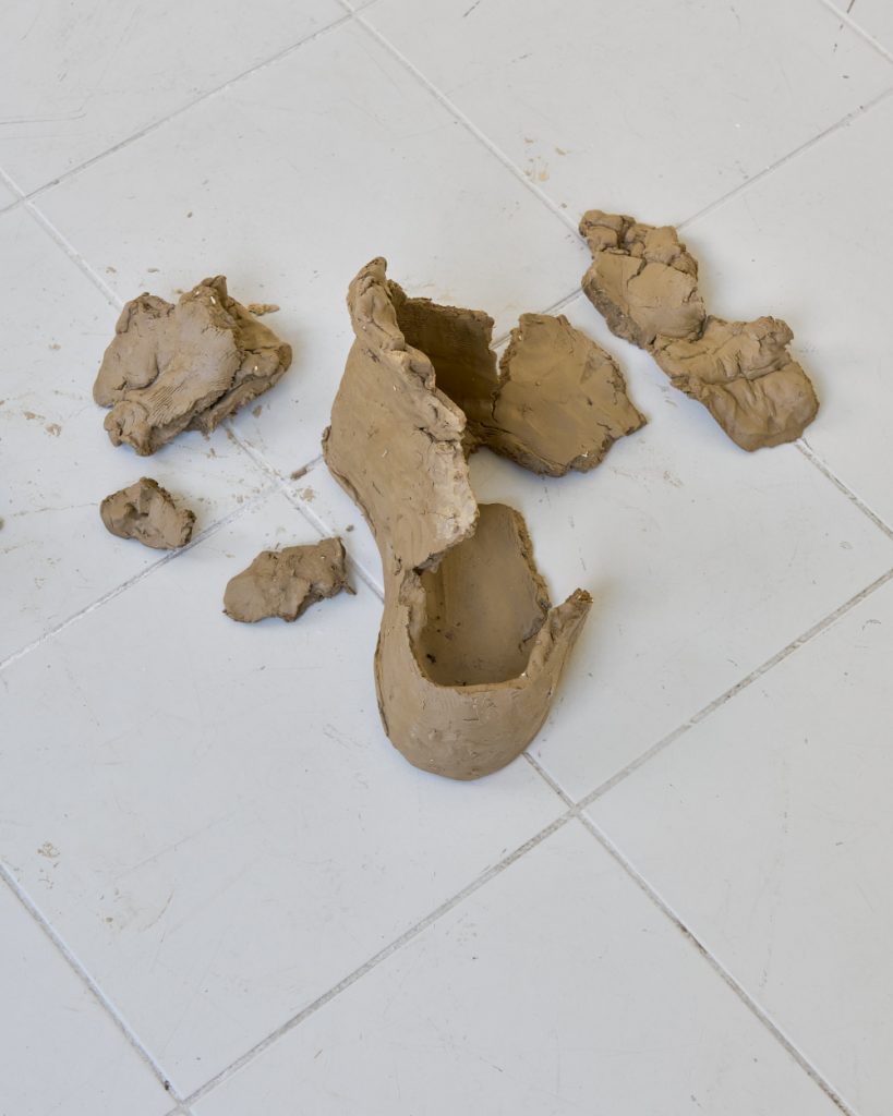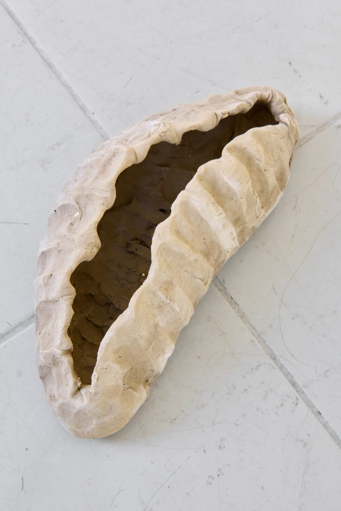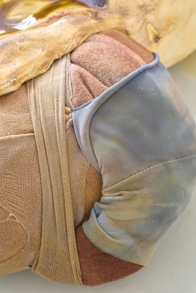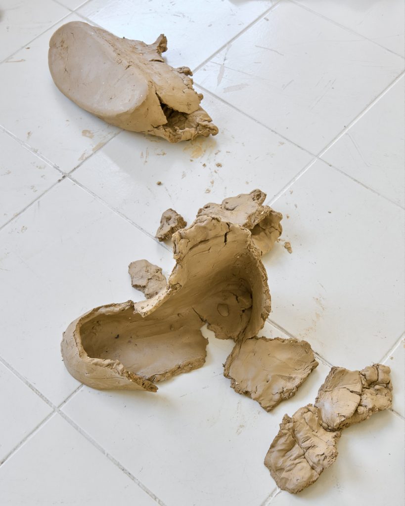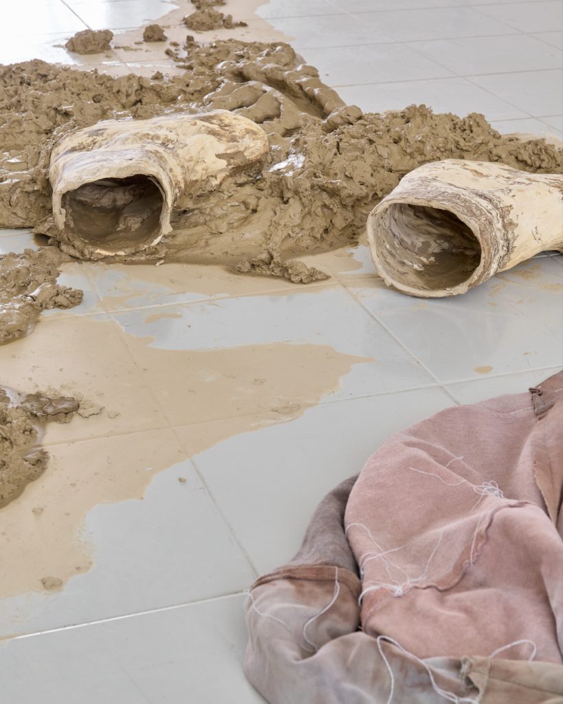 Projekt Aleuronové zrno Nely Britaňákové představuje neurčité prostředí utvářené těly, hlínou, textilem, v němž se stírá druhová identita. Ve zpomaleném světě přežívají zbytky života i zárodky nových forem nesoucí stopy úzkosti, transformace i pomalého zániku.